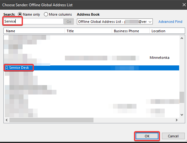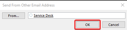 Type in the name of the mailbox you have permission to send from. Then click OK.