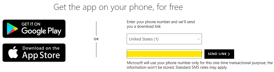 2. Alternatively, you can follow this link “https://www.microsoft.com/en-us/account/authenticator” on your computer. You will be directed to a page where you can put in your mobile phone number (Highlighted Yellow). Once you enter your phone number and hit send and a short URL will be sent to you via text. This short URL will bring you to the respective app store where you will be able to install the correct app.