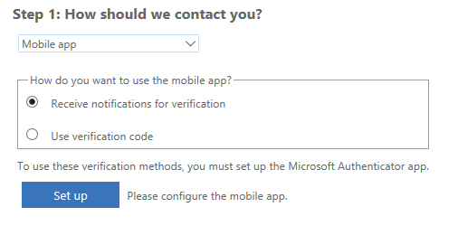 5. You will then get the prompt below. Make sure to select mobile app and receive notifications for verification (Note – Be sure to have the Authenticator app open for the next step).