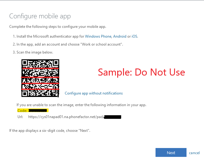 6. You should now see a QR code (see example below). After you open the Authenticator app on your phone, choose add account, then scan the code with your camera.