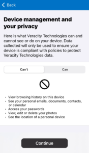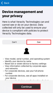 8) On the next screen, you will see a device management and privacy notice. By default, you are presented with information on what data can’t bee seen. Tap Can to view what data can be seen. Then, tap Continue to proceed.