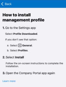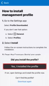 21) Exit the Settings app and go back to the Comp Portal app. You should see the following screen. Tap Yes, I installed the profile.