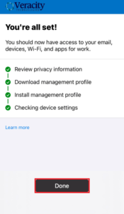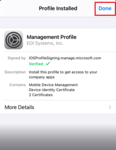 You have now finished the Microsoft Intune MDM enrollment process. You will see a list of the apps that are managed by your company. Some apps will be downloaded and installed on your iOS device automatically, others you can chose to install if needed.