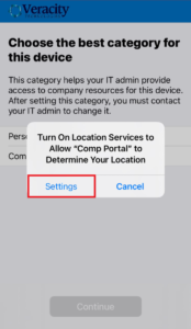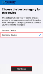 24) Go back to the Comp Portal app and you should see the following screen. Tap Company Device. Then, tap Continue.