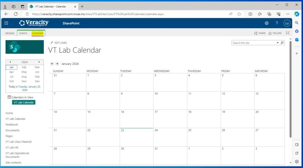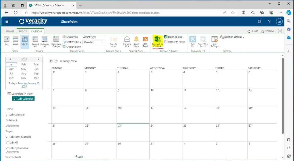 In an Internet Browser, browse to the SharePoint Calendar and click on the Calendar tab as highlighted below: