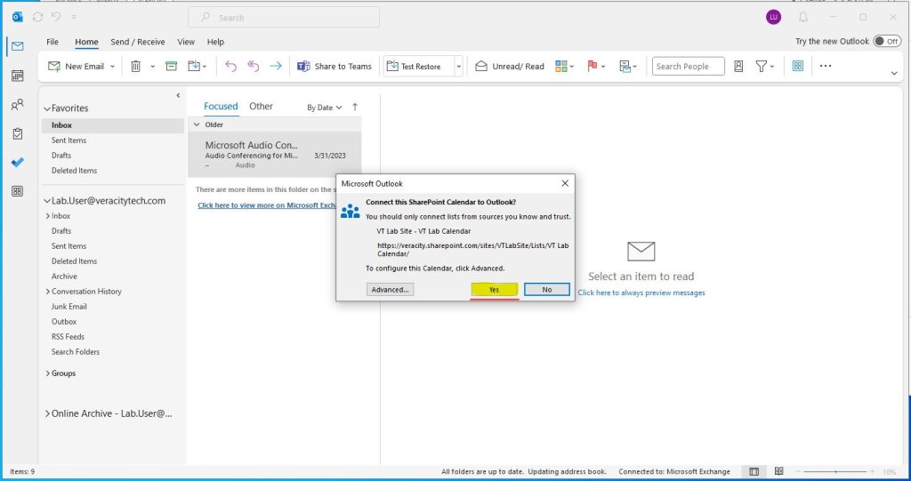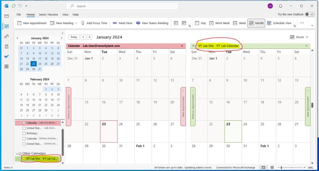 Once clicked, the SharePoint calendar will open in the “Other Calendars” category and show on the right with your other calendars in the display pane.