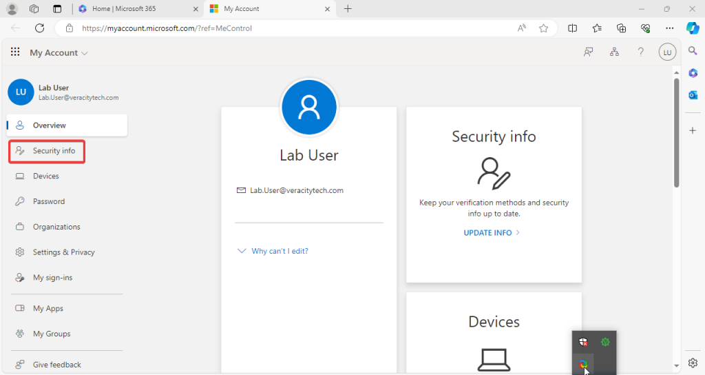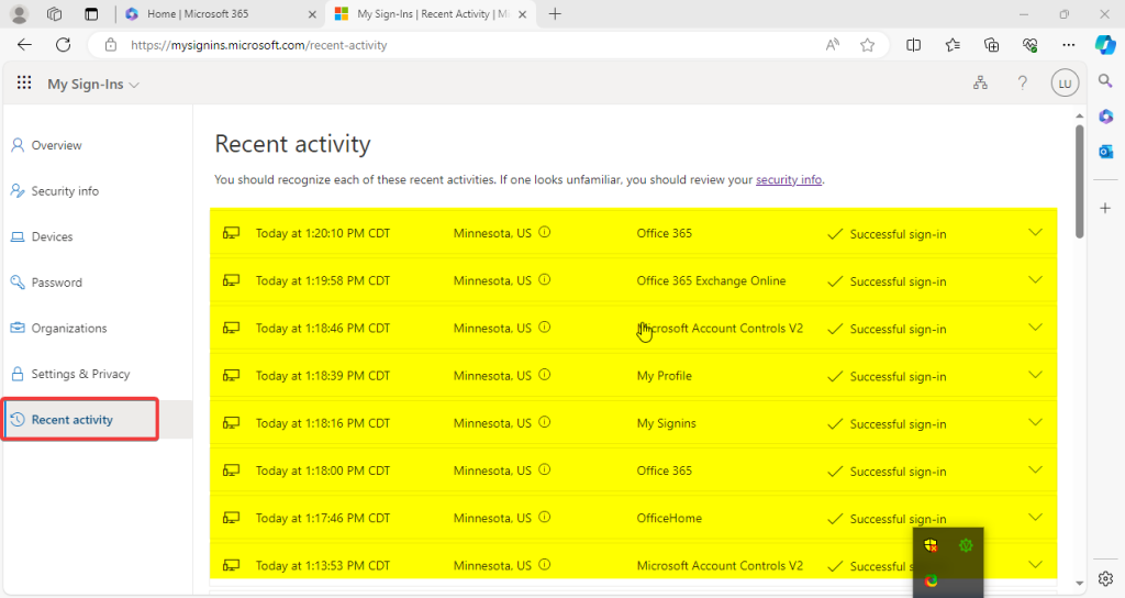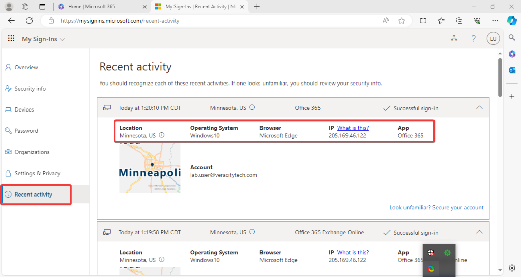 Click “Recent activity” or “My sign-ins” from the My Account tab. This will show you the most recent sign-ins for your account. It will show a general location, IP address, and other information such as the application or device type. If any sign-ins look suspicious, contact the service desk so a technician can help you evaluate these.